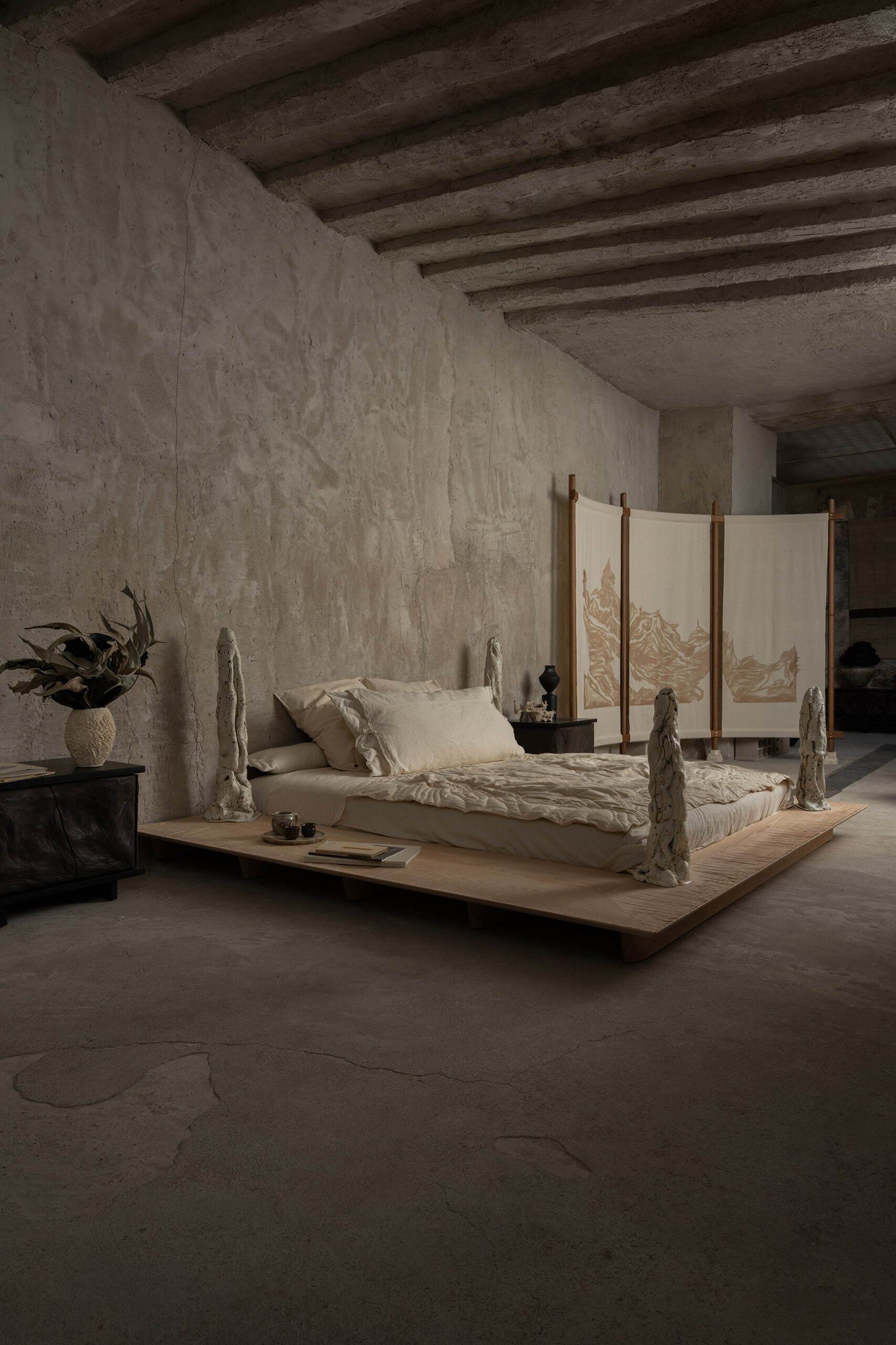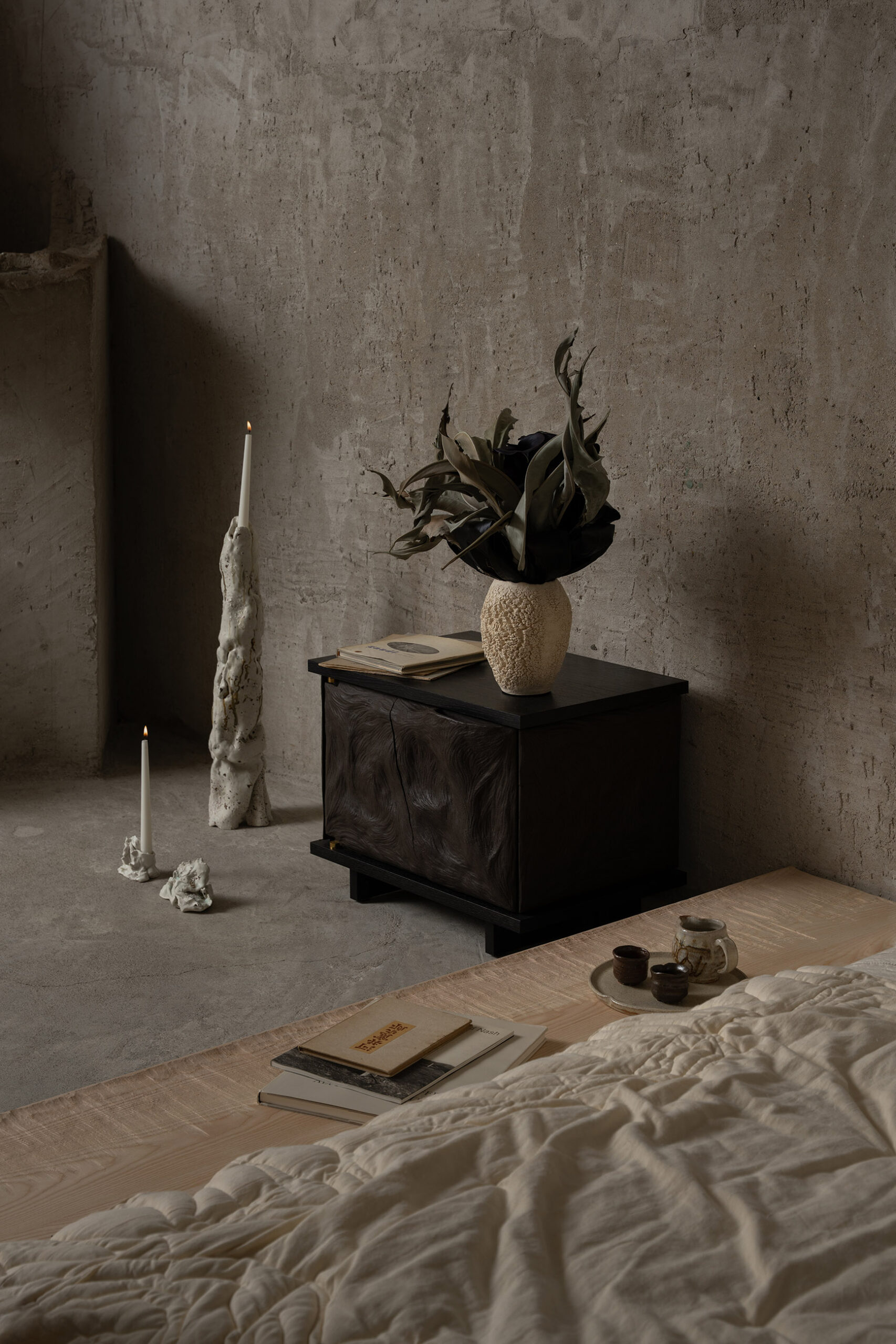 Console et chevets in attesa en chêne ébonisé et céramique noire et paravent « Le chant des Brumes » en noyer, pierre et lin présentés lors de l’exposition « noire » pendant PAD avec la galerie La Lune à Paris.