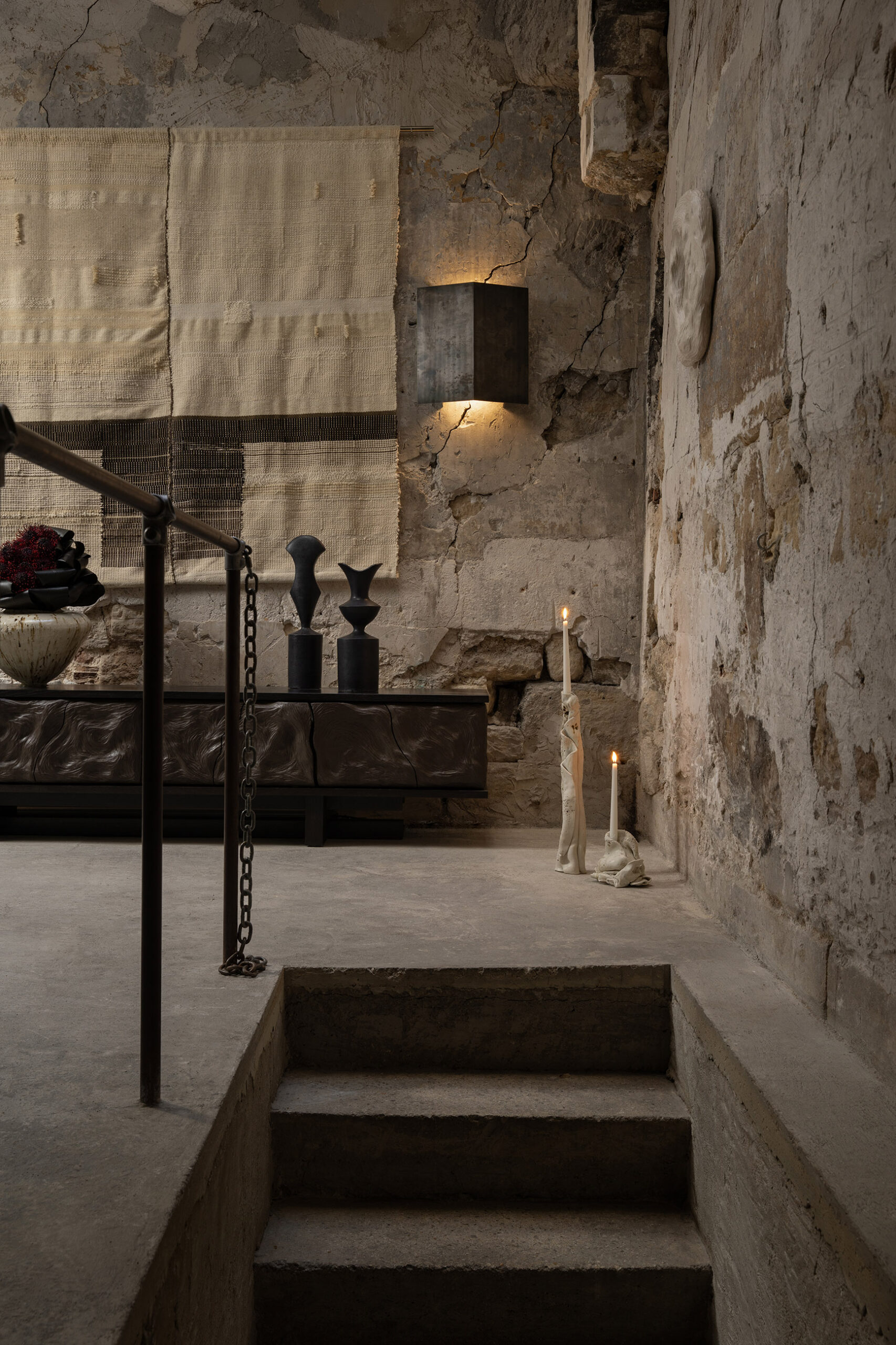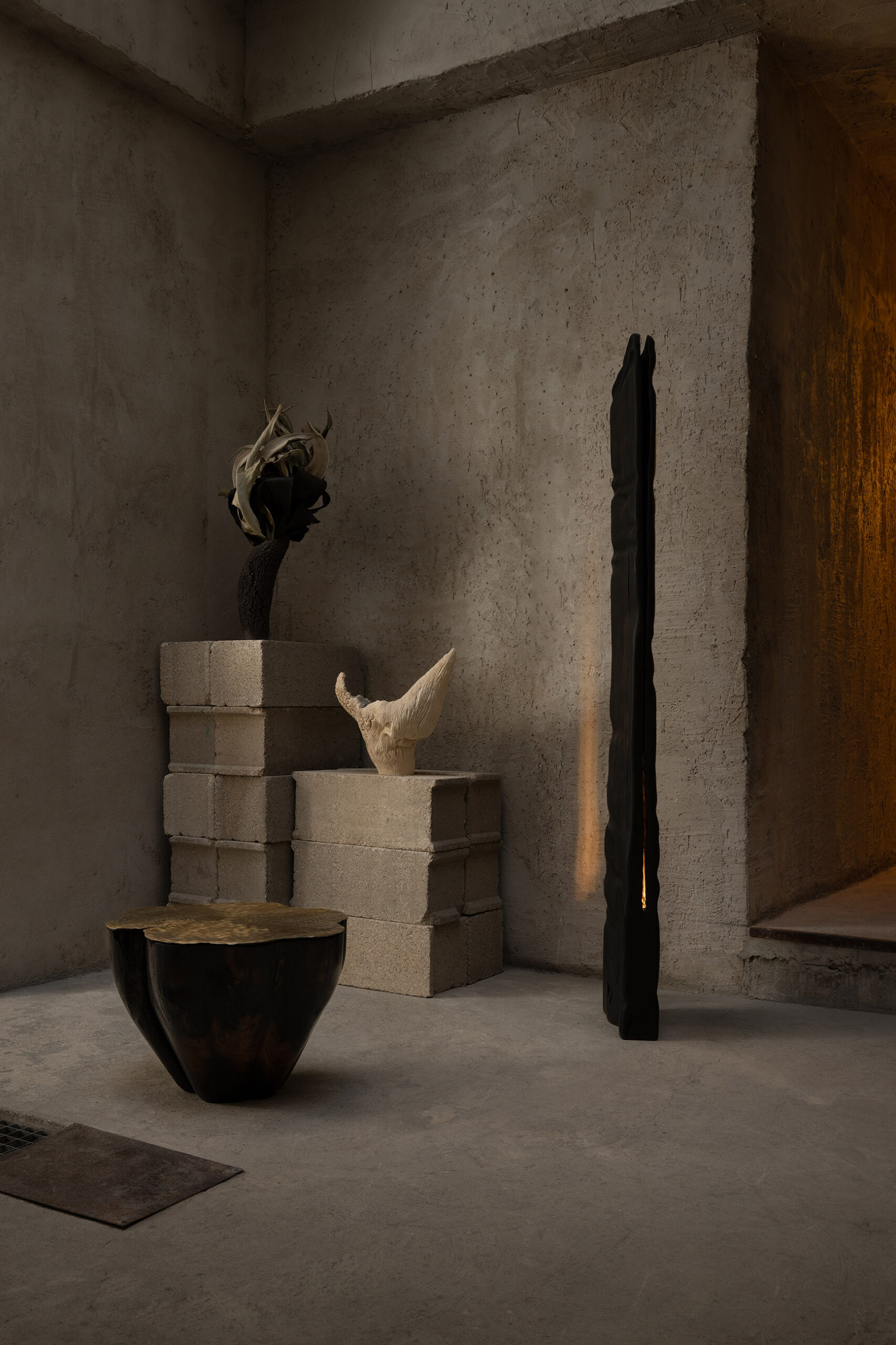 In attesa console & side table produced in ebonized french oak and black ceramic and « le chant des brume » screen in walnut, fabric and stone as part of the Noire exhibition during PAD FAirs with La Lune design gallery in Paris, France.