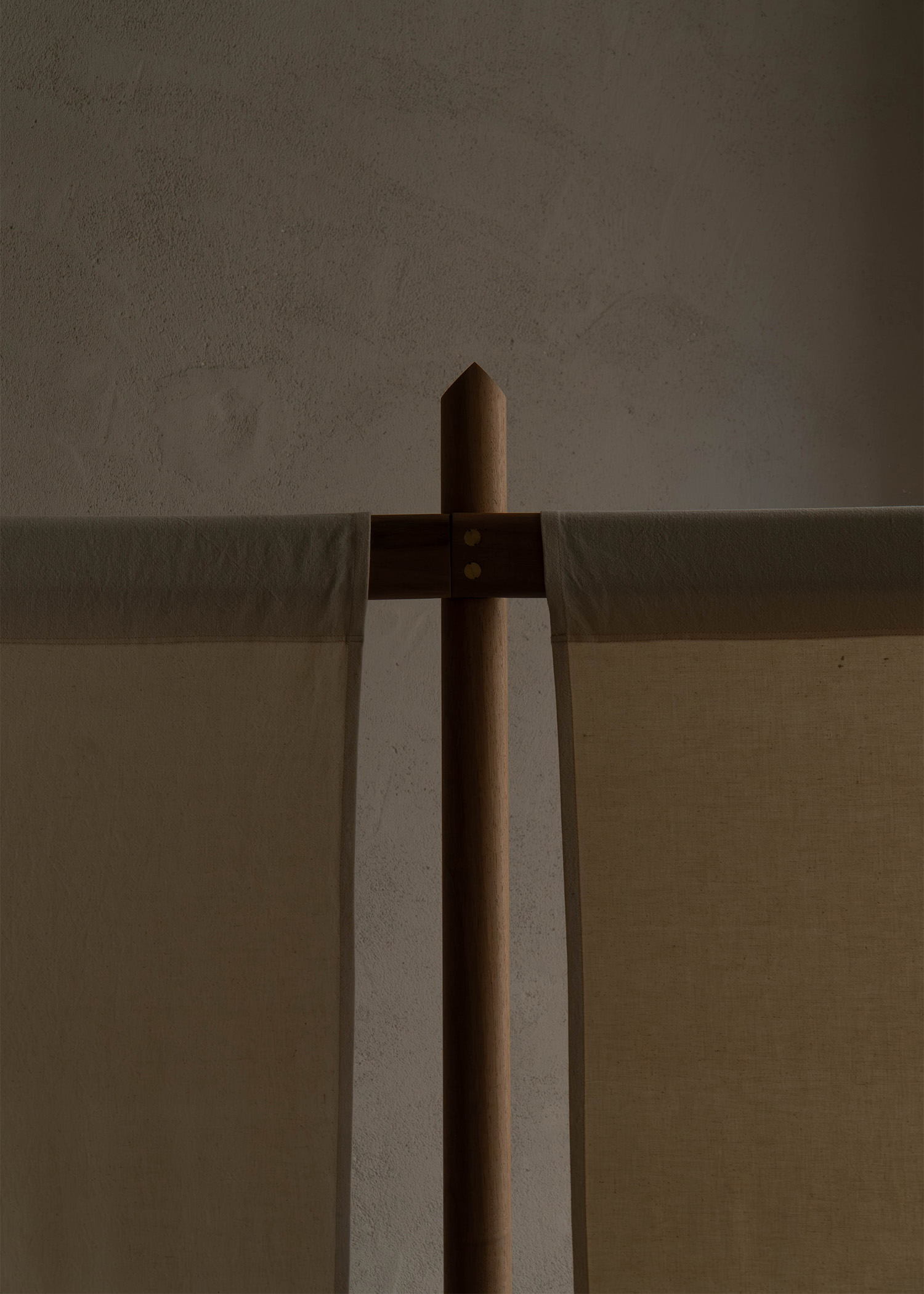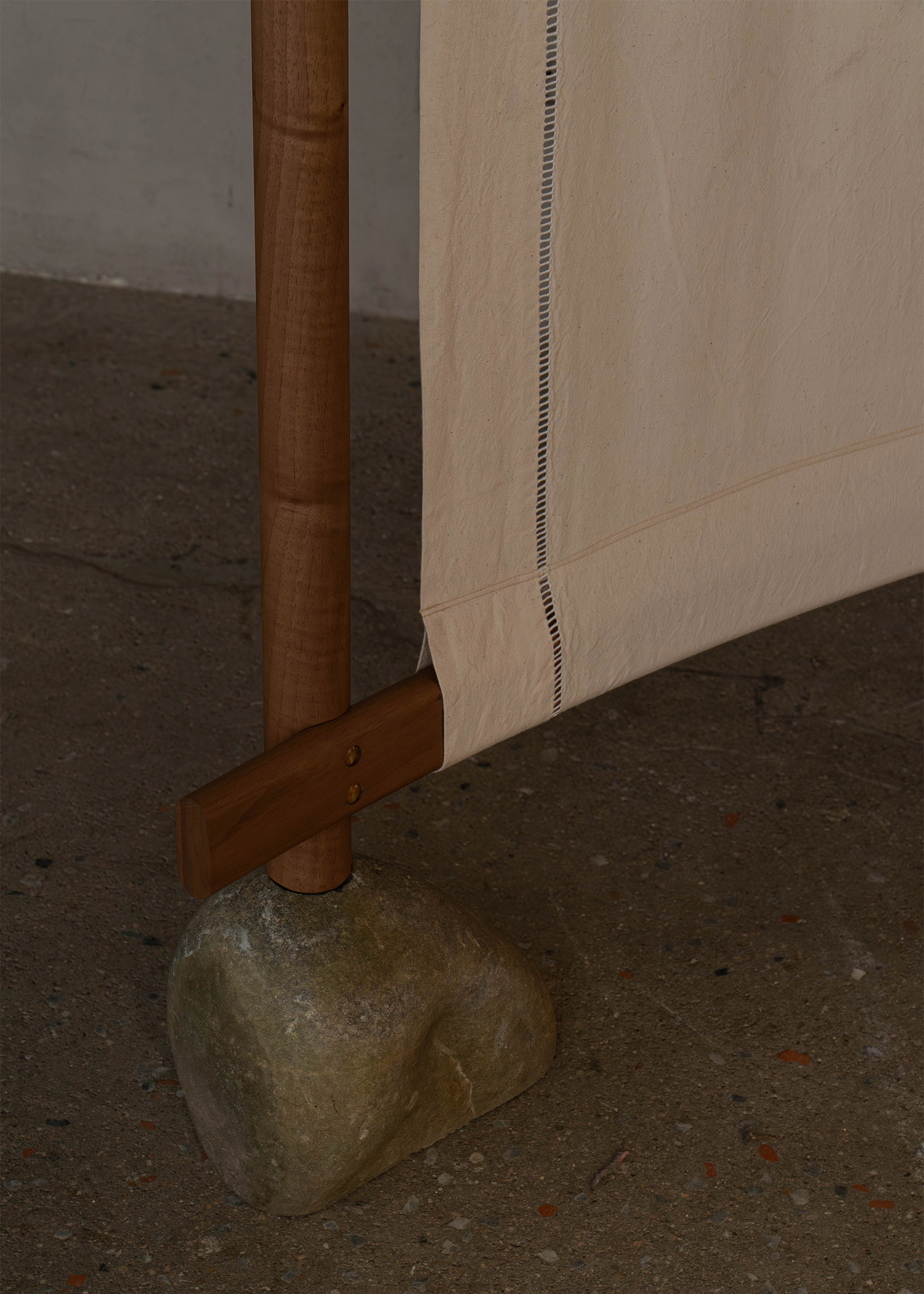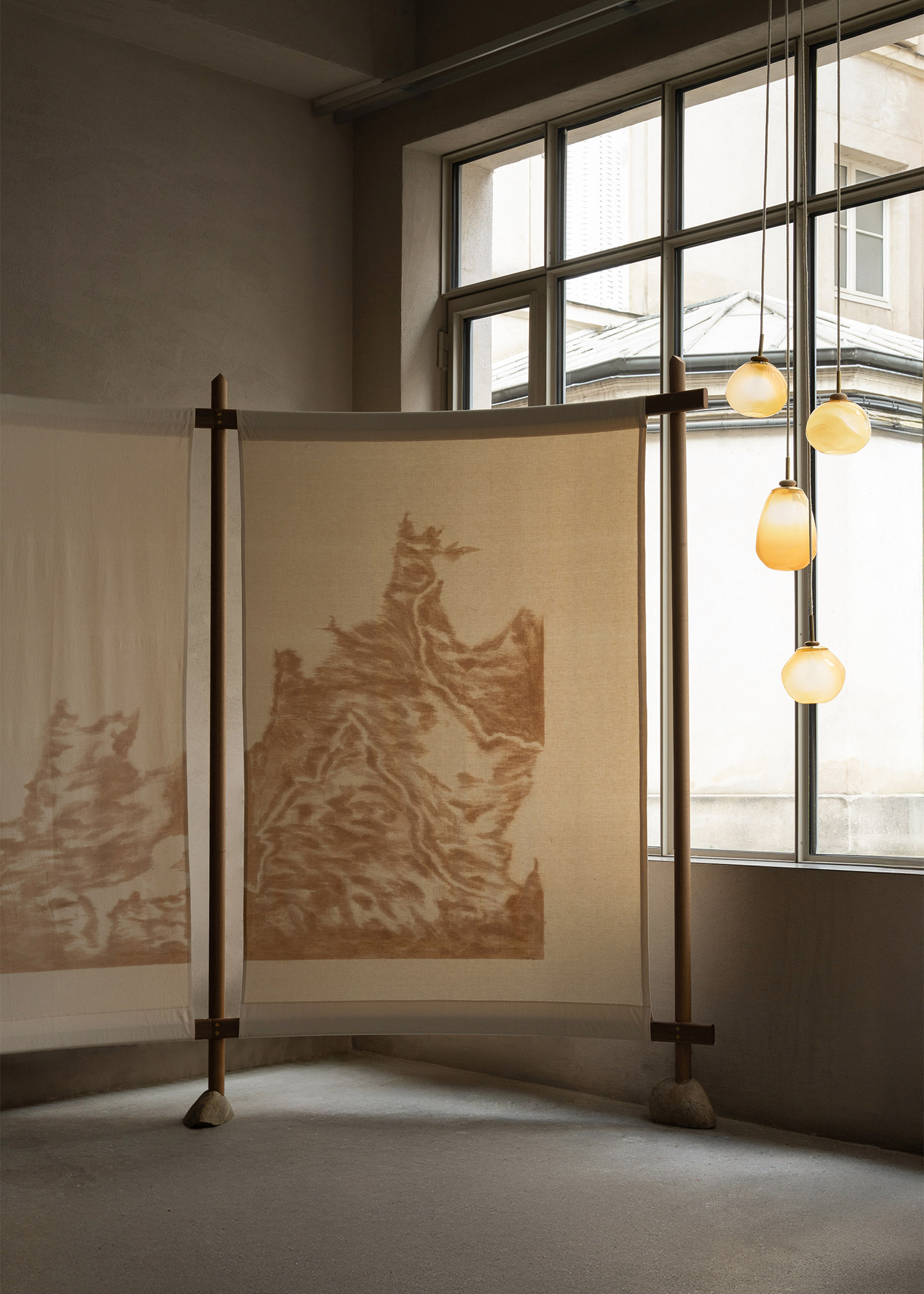 Séparateur d’espace courbé, drap étiré entre un lieu et un autre, offrant un abri aux regards. L’œuvre textile de Martin Bady, réalisée avec des encres végétales et des tissus anciens, révèle une pièce originale et unique pour chaque création. L’ensemble est tendu sur des lignes structurées en bois de noyer de Paul Michelon.
