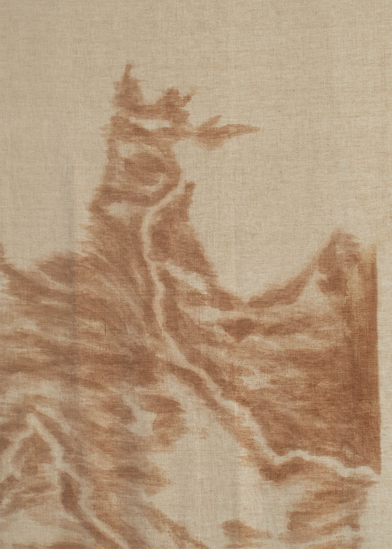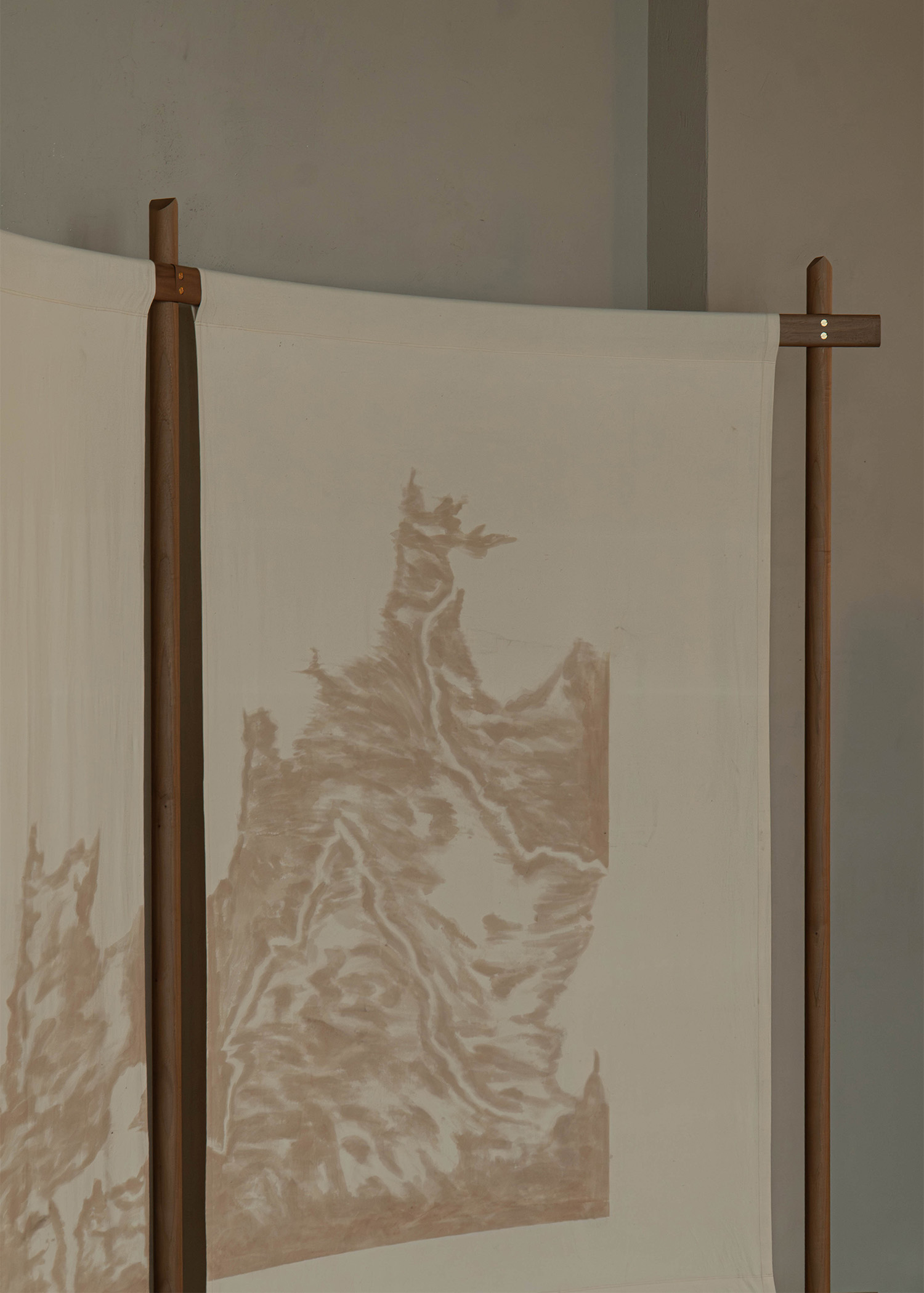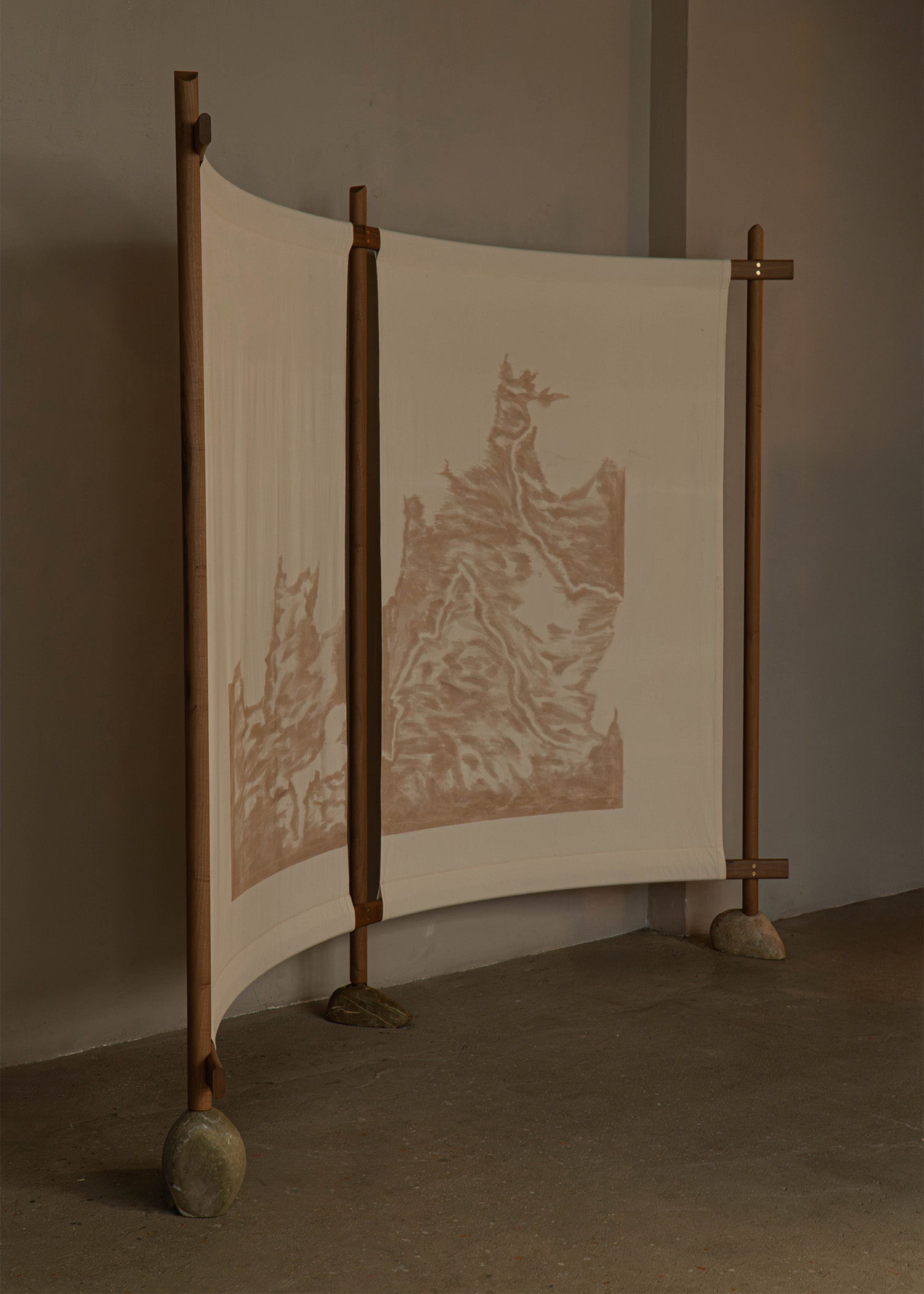 Séparateur d’espace courbé, drap étiré entre un lieu et un autre, offrant un abri aux regards. L’œuvre textile de Martin Bady, réalisée avec des encres végétales et des tissus anciens, révèle une pièce originale et unique pour chaque création. L’ensemble est tendu sur des lignes structurées en bois de noyer de Paul Michelon.